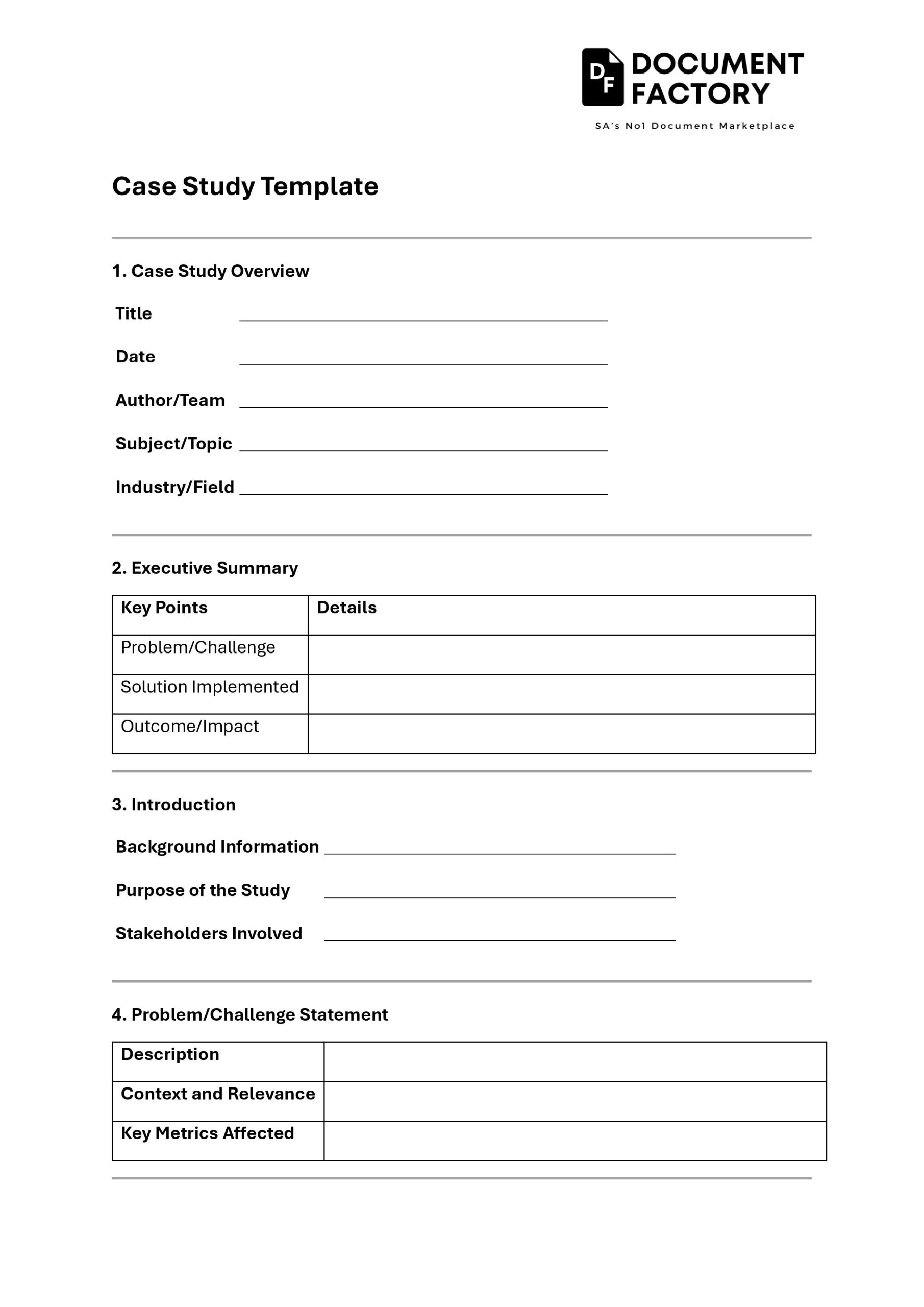 - Breaks down case study elements into clear, logical sections for easy documentation.