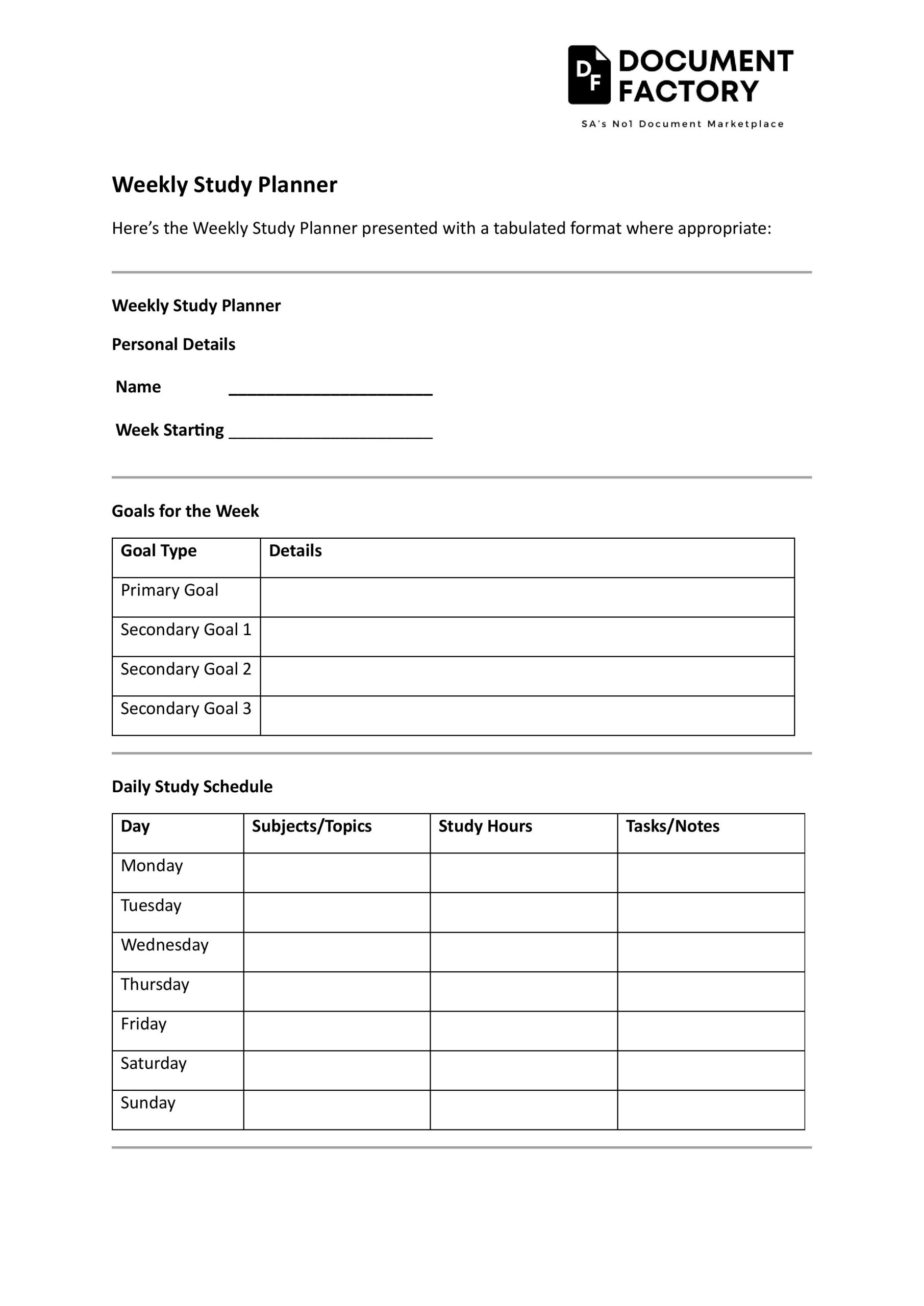 The Weekly Study Planner is a powerful tool designed to help students of all levels manage their study time effectively. With dedicated sections for setting weekly goals, scheduling daily study sessions, and reflecting on achievements, this planner ensures that you stay on track with your academic objectives. The tabulated format makes it easy to organize subjects, tasks, and study hours for each day of the week. Additionally, a reflection section allows you to identify challenges and make adjustments for the following week, promoting continuous improvement. Whether preparing for exams, completing assignments, or pursuing personal development, this planner provides the structure you need for success.